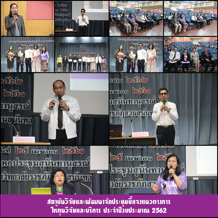 วันนี้ วันพุธที่ 25 เมษายน พ.ศ. 2561 สถาบันวิจัยและพัฒนา จัดประชุมชี้แจงแนวทางการให้ทุนวิจัยและบริการ ประจำปีงบประมาณ 2562 ณ หอประชุมสุนันทานุสรณ์ โดยได้รับเกียรติจาก ท่านอธิการบดี รองศาสตราจารย์ ดร.ฤๅเดช เกิดวิชัย เป็นประธานเปิดการประชุมและมอบเกียรติบัตรและโล่ห์เชิดชูเกียรติรางวัลนักวิจัยดีเด่น ประจำปี 2561 ให้กับนักวิจัย จำนวน 5 ท่านได้แก่