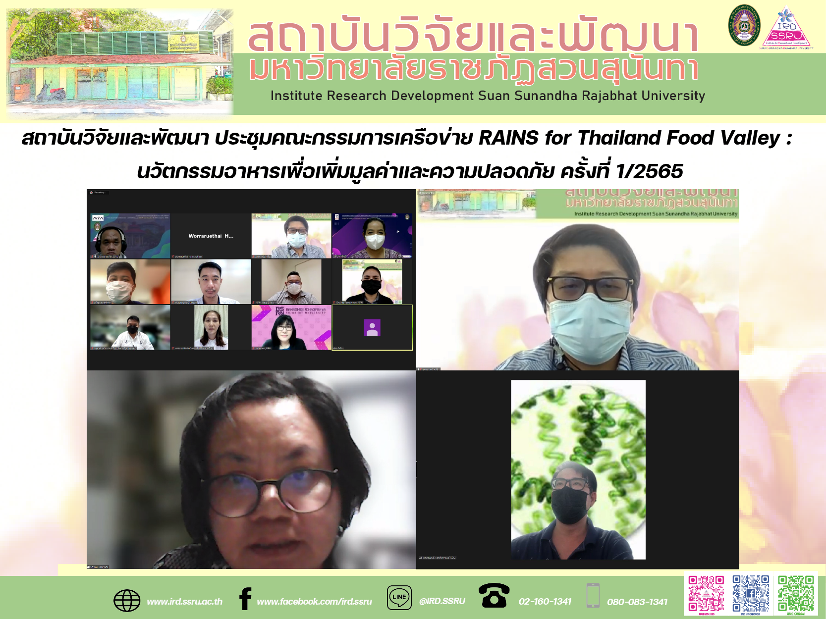 วันที่ 19 สิงหาคม 2565 เวลา 13.30 น. รศ.ดร.รจนา จันทราสา ผู้อำนวยการสถาบันวิจัยและพัฒนา มหาวิทยาลัยราชภัฏสวนสุนันทา มอบหมายให้ ผศ.มรกต วรชัยรุ่งเรือง รองผู้อำนวยการฝ่ายวิจัยและเผยแพร่ เป็นประธานในการประชุมคณะกรรมการเครือข่าย RAINS for Thailand Food Valley : นวัตกรรมอาหารเพื่อเพิ่มมูลค่าและความปลอดภัย ครั้งที่ 1/2565 ในรูปแบบการประชุมออนไลน์ Zoom Meeting ซึ่งมีคณะกรรมการเครือข่าย ประกอบด้วย ผศ.ดร.ยุทธนา สุดเจริญ รองผู้อำนวยการฝ่ายบริหาร ผศ.ดร.วัฒน์ พลอยศรี รองผู้อำนวยการฝ่ายบริการวิชาการ อาจารย์อทิตยา บัวศรี ผู้จัดการหน่วยบ่มเพาะวิสาหกิจ นางสาวพรทิพย์ เรืองปราชญ์ หัวหน้าสำนักงาน นางสาวชุติมา ธีรสุวรรณ หัวหน้าฝ่ายวิจัยและเผยแพร่ นายอนุพันธ์ สุทธิมาร หัวหน้าฝ่ายบริหารงานทั่วไป และคณะกรรมการเครือข่ายหน่วยงานภายนอกมหาวิทยาลัย จากมหาวิทยาลัยธุรกิจบัณฑิต มหาวิทยาลัยรังสิต มหาวิทยาลัยสวนดุสิต มหาวิทยาลัยราชภัฏธนบุรี และมหาวิทยาลัยเทคโนโลยีราชมงคลพระนคร โดยมีประเด็นวาระสำคัญ เรื่อง รายงานการดำเนินงานโครงการวิจัย “การพัฒนาโมเดลการบริหารจัดการงานวิจัยอาหารเชิงหน้าที่และอาหารเพื่อความปลอดภัย ประจำปีงบประมาณ พ.ศ. 2565 ภายใต้ RAINS for Thailand Food Valley : นวัตกรรมอาหารเพื่อเพิ่มมูลค่าและความปลอดภัย การรายงานผลการติดตามความก้าวหน้าโครงการย่อย ครั้งที่ 1 (รอบ 2 เดือน) ประจำปีงบประมาณ พ.ศ. 2565 ร่วมกับหัวหน้าโครงการวิจัยย่อย การแลกเปลี่ยนข้อมูลงานวิจัยของมหาวิทยาลัยในเครือข่ายเพื่อการจัดทำแผนงานวิจัย RAINS for Thailand Food Valley ในปีงบประมาณ 2566 และวาระสำคัญอื่นๆ ที่เกี่ยวข้อง