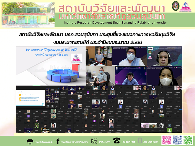 วันพุธที่ 21 กันยายน 2565 ฝ่ายวิจัยและเผยแพร่ สถาบันวิจัยและพัฒนา มหาวิทยาลัยราชภัฏสวนสุนันทา ประชุมชี้แจงแนวทางการขอรับทุนวิจัย งบประมาณรายได้ ประจำปีงบประมาณ พ.ศ. 2566 ในรูปแบบออนไลน์ผ่านระบบ Zoom Meeting ให้แก่ผู้บริหาร คณาจารย์ และนักวิจัยของมหาวิทยาลัยราชภัฏสวนสุนันทา ได้รับทราบและเข้าใจเกี่ยวกับแนวทาง ขอบเขตการดำเนินงานด้านการวิจัยให้เป็นไปในทิศทางเดียวกัน โดยได้รับเกียรติจาก รศ.ดร.รจนา จันทราสา ผู้อำนวยการสถาบันวิจัยและพัฒนา เป็นประธานการประชุมและกล่าวชี้แจงแนวทางการให้ทุนอุดหนุนการวิจัยงบรายได้ ประจำปีงบประมาณ พ.ศ. 2566 และแผนการดำเนินงานพลิกโฉมมหาวิทยาลัยราชภัฏสวนสุนันทา ด้านการวิจัย ประจำปีงบประมาณ พ.ศ. 2566 พร้อมด้วย ผศ.มรกต วรชัยรุ่งเรือง รองผู้อำนวยการฝ่ายวิจัยและเผยแพร่ กล่าวชี้แจงแนวทางการขอรับทุนวิจัย งบประมาณรายได้ ประจำปีงบประมาณ พ.ศ. 2566 ทั้งนี้มี ผู้ช่วยศาสตราจารย์ ดร.ยุทธนา สุดเจริญ รองผู้อำนวยการฝ่ายบริหาร ผศ.ดร.วัฒน์ พลอยศรี รองผู้อำนวยการฝ่ายบริการวิชาการ อาจารย์อทิตยา บัวศรี ผู้จัดการหน่วยบ่มเพาะวิสาหกิจ นางสาวพรทิพย์ เรืองปราชญ์ หัวหน้าสำนักงาน คณะทำงานสถาบันวิจัยและพัฒนาที่เกี่ยวข้อง ผู้บริหาร คณาจารย์ และนักวิจัยจากหน่วยงานคณะและวิทยาลัย เข้าร่วมกว่า 230 คน